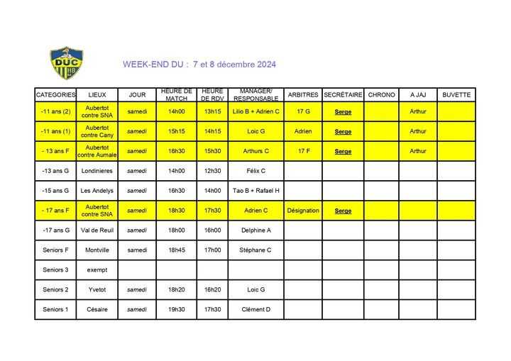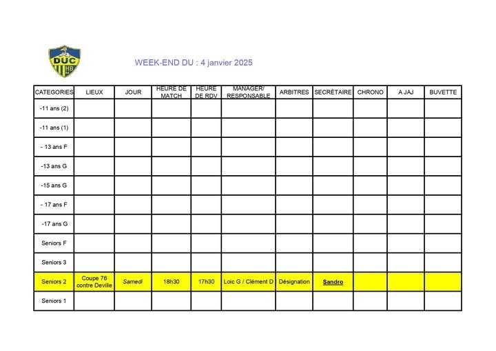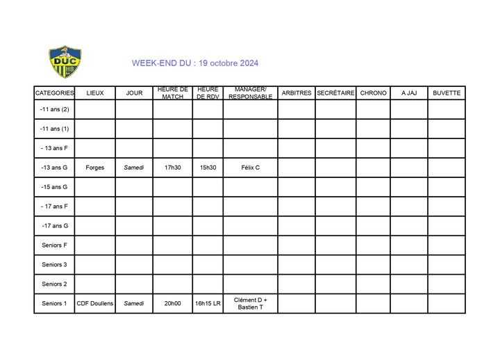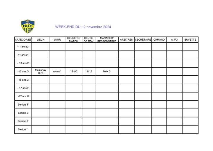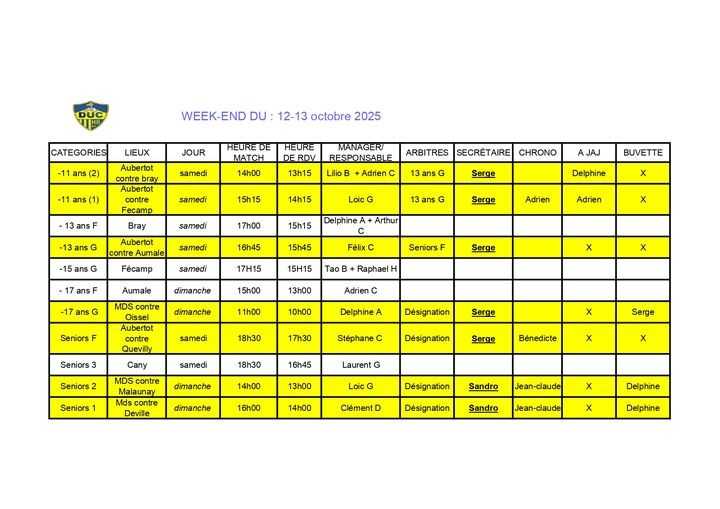 Planning match 12-13 Octobre